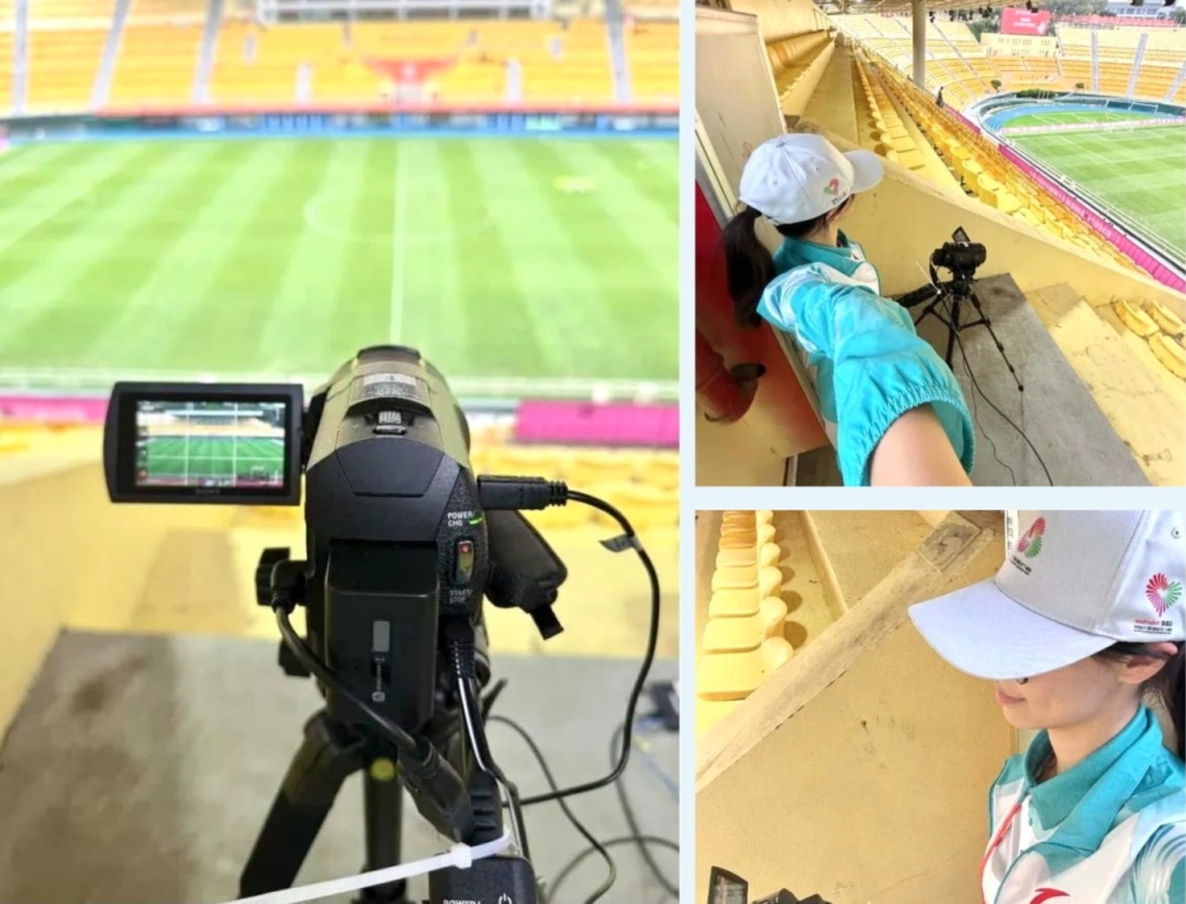 每天,我都用摄像机记录比赛全程,从旗手入场到球场空无一人,不放过任何细节。最累的时候,看着空荡荡的球场,真想放弃。但想到电子裁判可能因我的记录还原赛场真相,保障赛事公平,我又咬牙坚持下来。在服务过程中和看台服务志愿者的协作让我印象深刻,第一天面对频繁遮挡镜头的观众,我主动求助,看台志愿者立刻在周围暖心提醒,默契配合让录制顺利进行。志愿者观察处的志愿者们也总在我疲惫时送来水等物资,结束后还帮忙收拾设备,这份关怀让我倍感温暖。